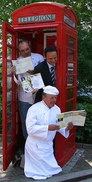 Wie man sieht muss man auch für die Pressefotografen Kniefälle machen und sich in eine enge Telefonzelle zwängen. Im Bild: Ulrich Pokorra, Thomas Dettenberg und Heinrich Wächter.