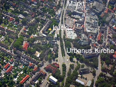 Wir sind nun direkt über der City von Buer. Rechts von einer gedachten Linie zwischen Urbanus Kirche und dem Buerschen Wochenmarkt liegt das Einkaufszentrum. Der gelbe Pfeil zeigt auf Lucki's Wohnsitz ...smile.