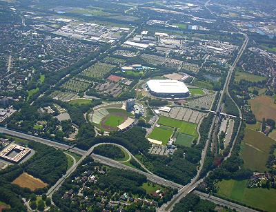 Weiter in südlicher Richtung sehen wir die Autobahnabfahrt Buer, das alte Parkstadion und die Veltinsarena.